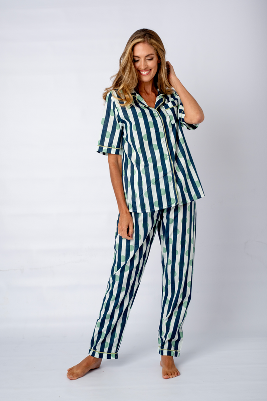 Classic Pj, Short Sleeve Top and Long Pant | Mint Dot Navy Stripes | 100% Cotton