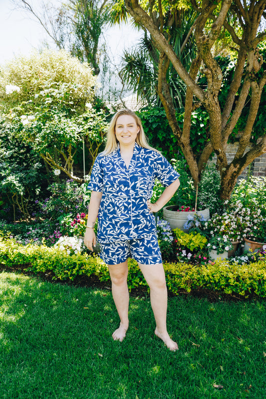 Short Set | Navy with White Leaves | 100% Rayon