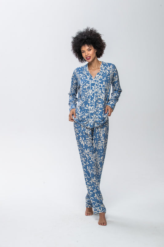Long Sleeve Mandarin Top & Long Pant | Misty Blue | 100% Rayon
