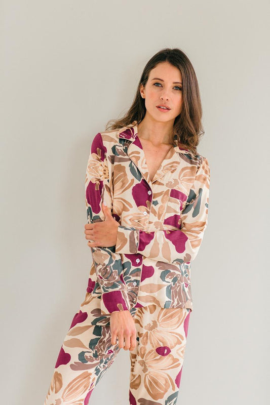 Long Sleeve Top & Pant | Stone with Plum Floral | 100% Rayon