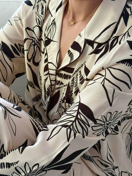 Long Sleeve Top and Long Pant | Biscuit with Black Leaf Floral | 100% Rayon