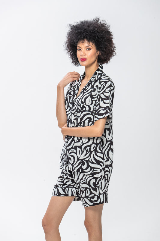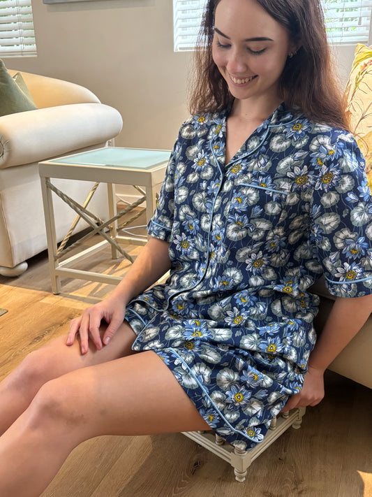 Short Set | Blooming in Blues White with Blue Block | 100% Rayon
