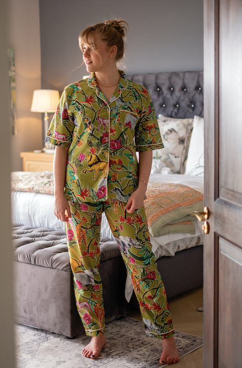 Short Sleeve Top and Long Pant | Green Elephant | 100% Indian Cotton