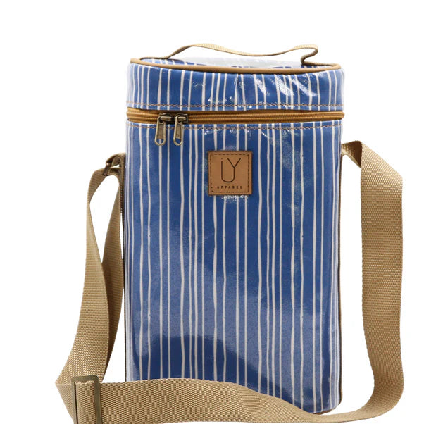 The wine cooler fits two wine or champagne bottles. All binding and trims are canvas. The cooler includes a waterproof lining and insulated inner layer to ensure the contents stay cool. The outer fabric is laminated to ensure the fabric is waterproof and can be wiped clean.